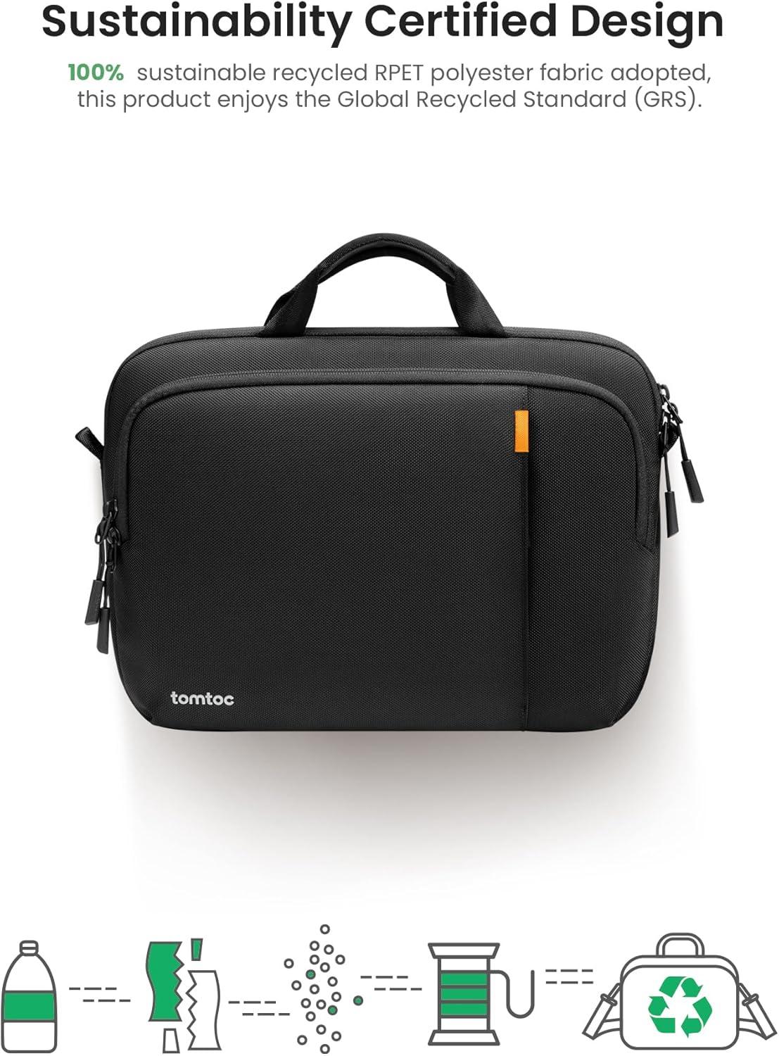 Premium Durability & Sustainable Ethos: At tomtoc, we take every step to save our planet. Crafted from sustainable recycled RPET polyester 210D fabric, this briefcase proudly holds the GRS certification. Besides, the briefcase underscores its durability by including premium YKK zippers and buckles, ensuring a blend of quality and sustainability values with each use