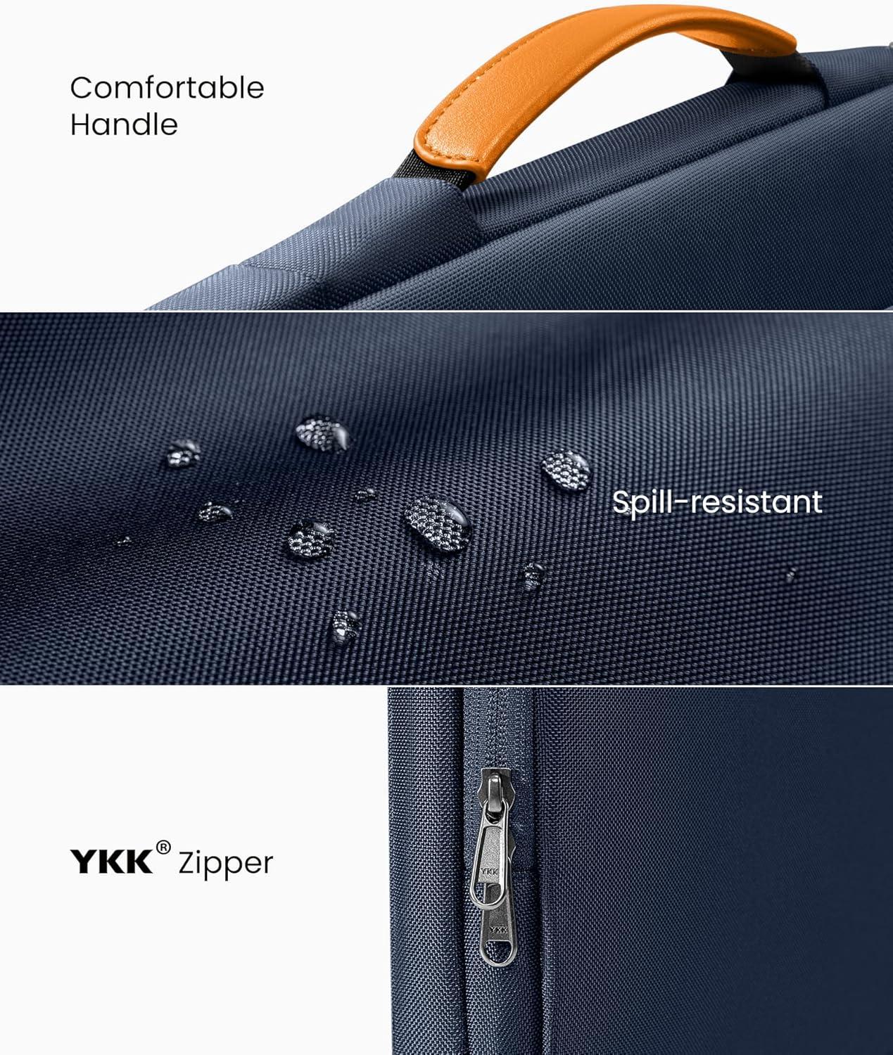 Quality Meets Performance: Top-quality YKK zippers and padded PU leather handles provide you with maximum comfort. Water-resistant recycled fabrics and soft fleece sophisticated interline design lining meet or exceed your expectations for laptop bag quality. Enable us to give complete protection to your computer while also protecting our environment