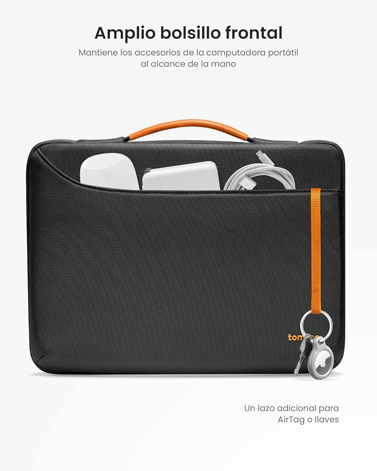 Large Front Pocket for Easy Storage: The laptop sleeve has a spacious and practical front pocket that easily holds commuting accessories such as a charger, power adapter, cables, keyboard, mouse, etc. It can also fit a tablet up to an 11-inch iPad Pro. What's more, an additional strap is provided for Airtag or key