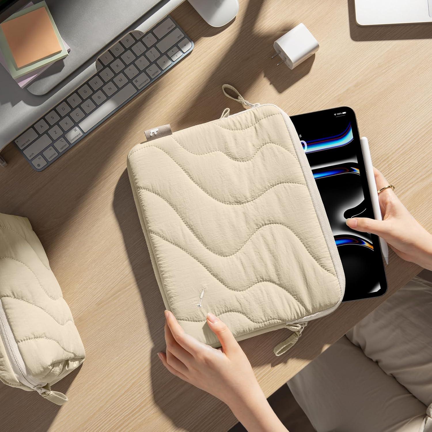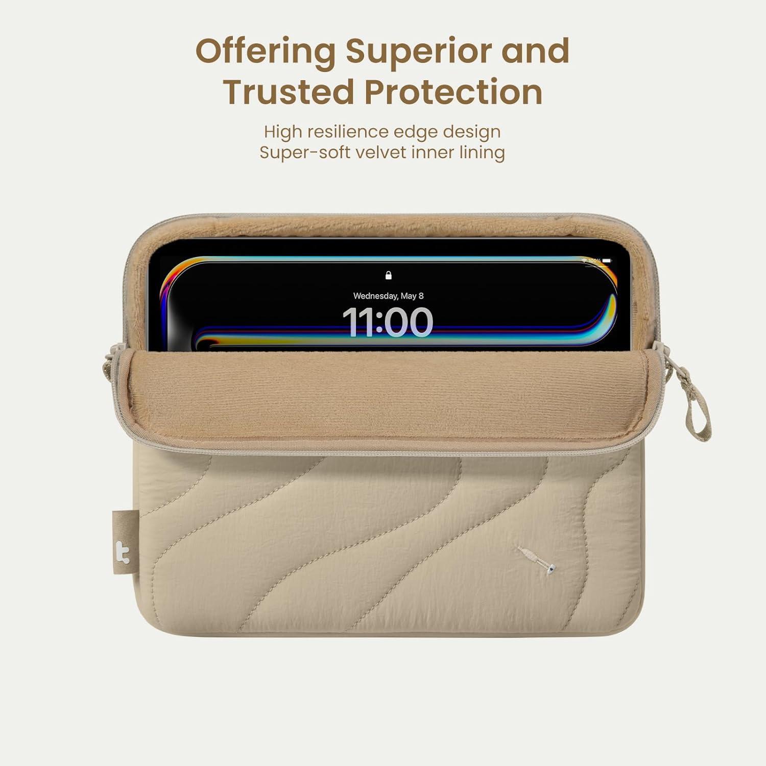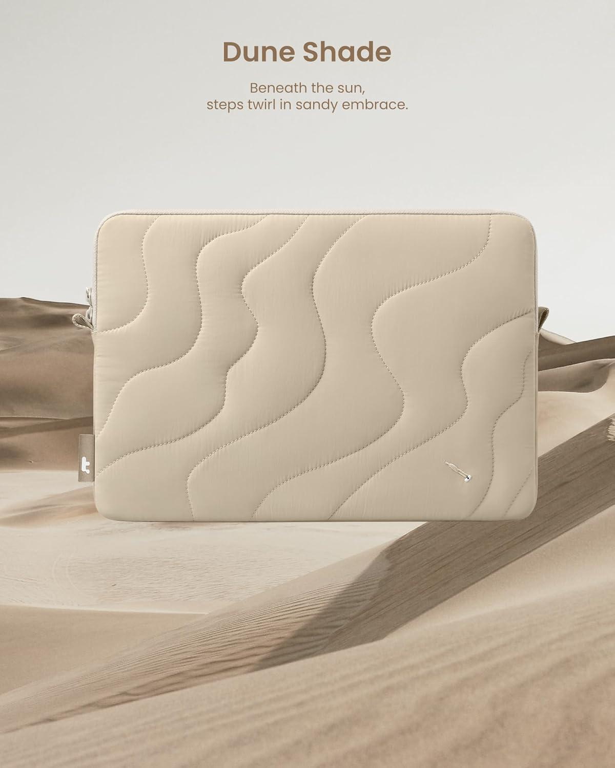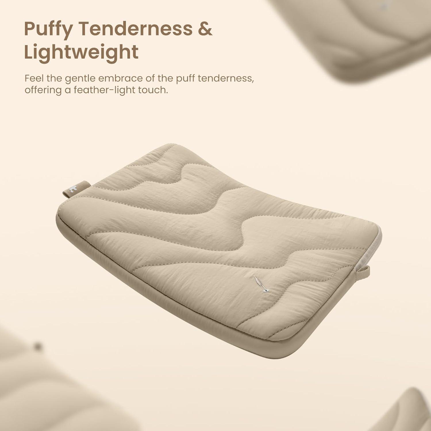 Puffy Tenderness & Durability: Imagine your device enveloped in our quilted design sleeve, crafted with a puff-like softness yet firm in structure. This sleeve, resembling a plush cushion, offers your tech the perfect blend of tenderness and robust protection. It slides smoothly into larger bags, always holding its shape, and provides a snug, secure fit for your device. Experience the unique combination of tenderness and durability