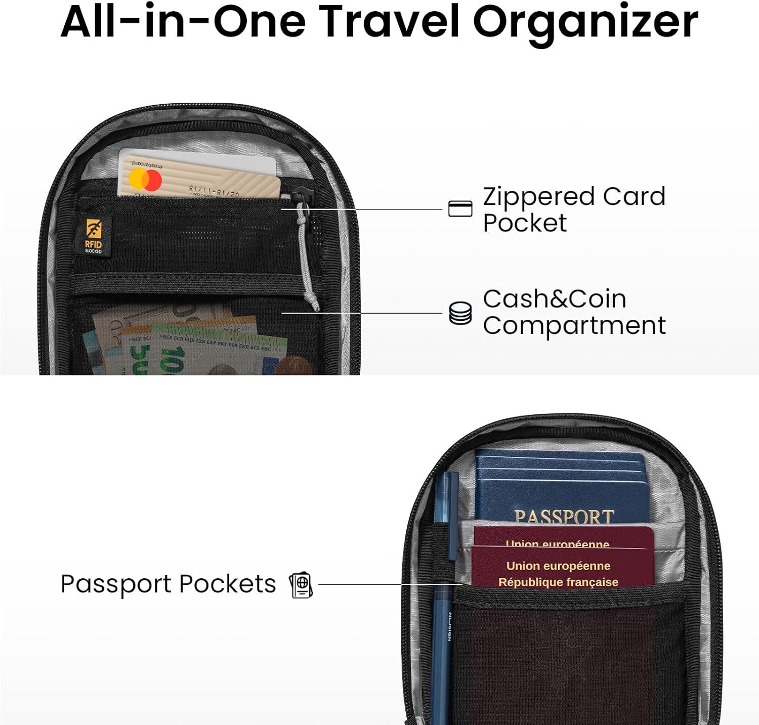 Smart & Organized Travel Companion – Holds 4-6 passports, with dedicated pockets for cash, coins (mesh pouch), cards (zippered pocket), phone, power bank—keeping everything neatly in place