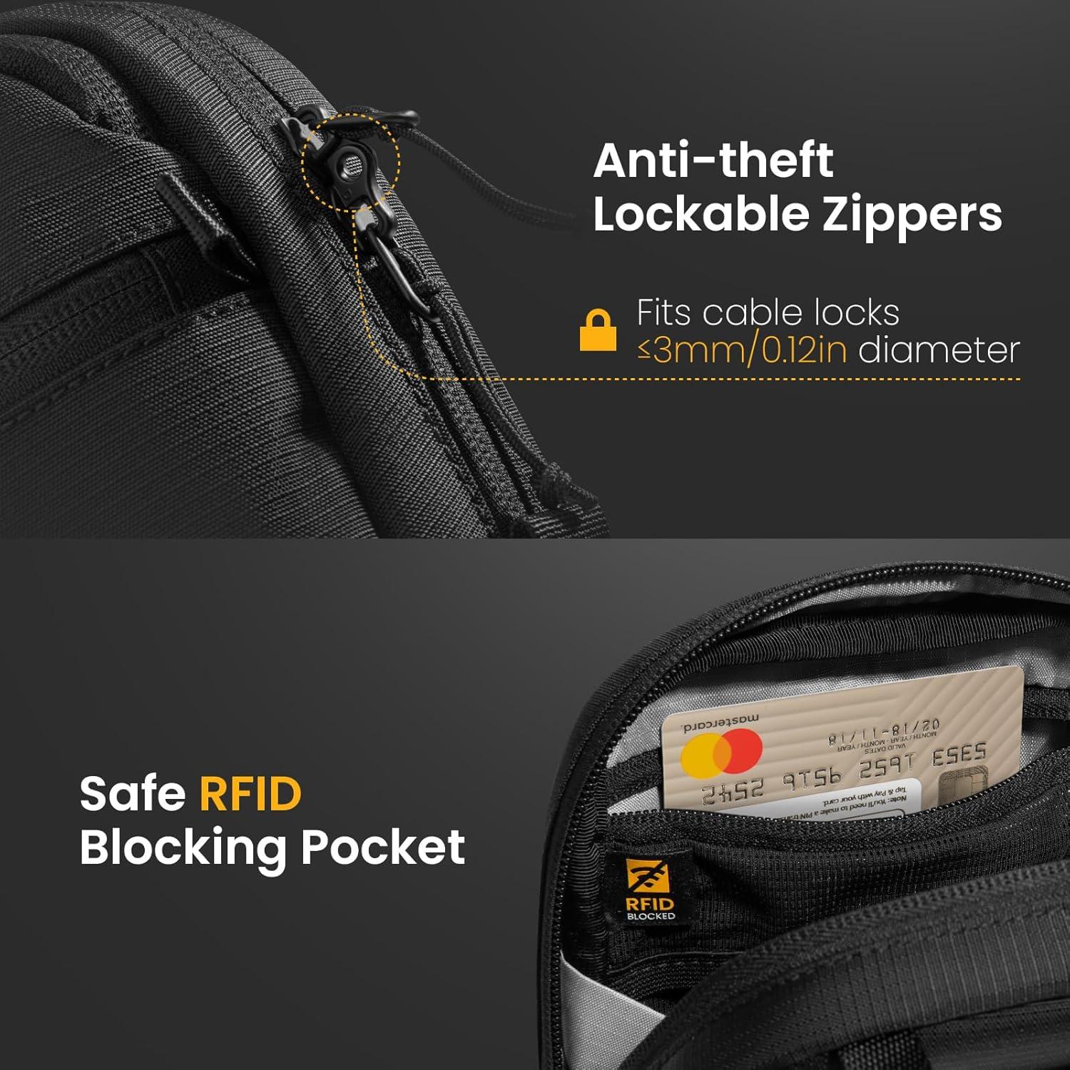 RFID Protection & Anti-Theft Design – tomtoc Aviator-T37 travel sling features an RFID-blocking pocket to protect your credit cards and ID card from electronic theft, plus a lockable main zipper for added security. Note: Fits cable locks ≤3mm/0.12in diameter(Lock NOT Included)